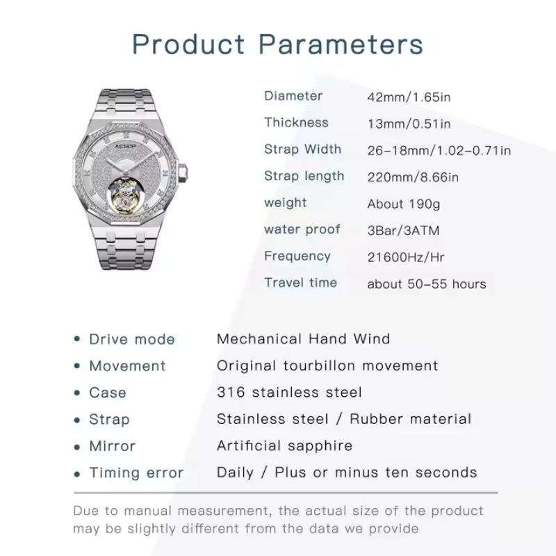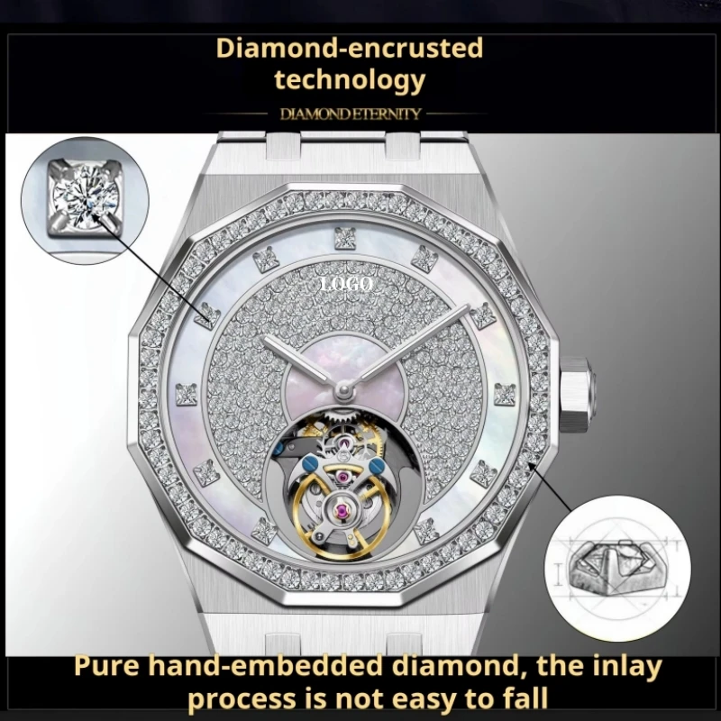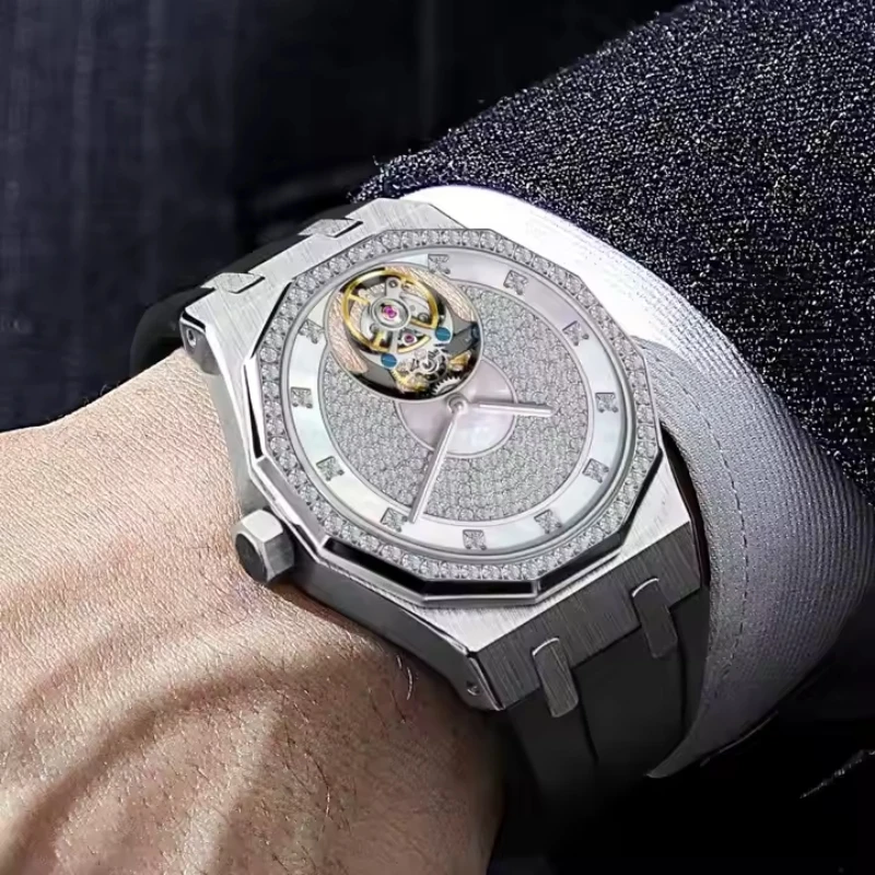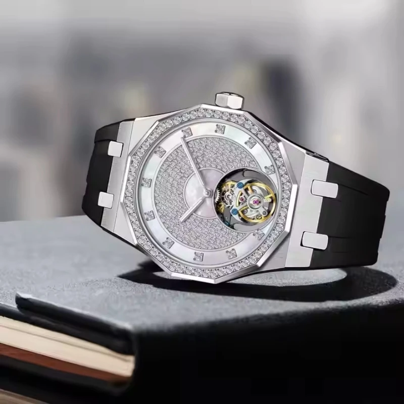 Custom Luxury Mother of Pearl Dial Crystal Bezel Silicone Strap Watch Luxury Full Diamond Business Men's Real Tourbillon Watch